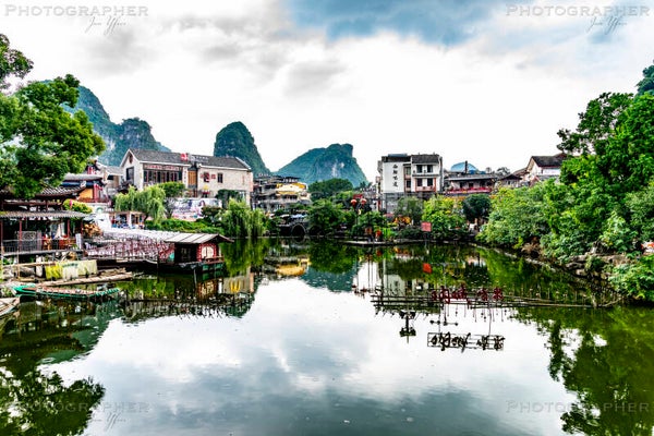 Yangshou sett från färjeläget när man kommer in med flodbåten på Li River.